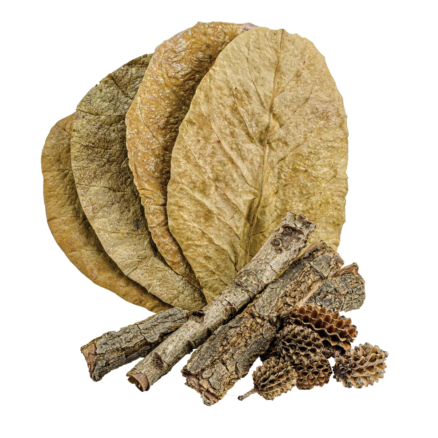 Includes: (5) Indian Almond Leaves (2) Catapp Almond Bark pieces and (9) Casuarina Cones